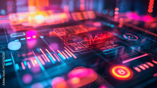 Illustration of a high-tech manufacturing factory floor, glowing holographic technology innovation graphs and data, perfect lighting setup