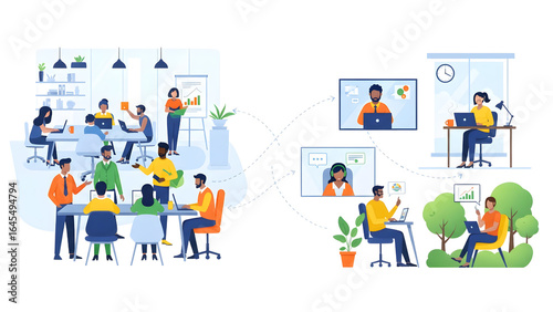 Illustration of a hybrid work model, showing a team collaborating in an office and people working remotely online.
