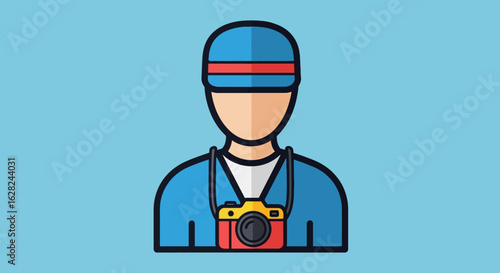 Illustration of a person with a camera hanging around their neck, wearing a cap, against a light blue background.