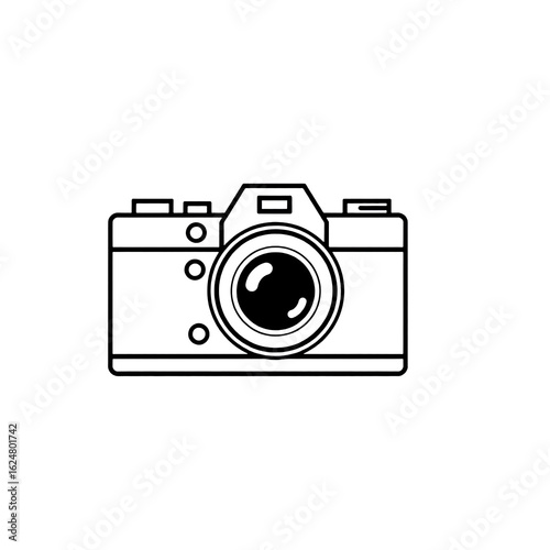 Illustration of a retro-style digital camera with a large lens.