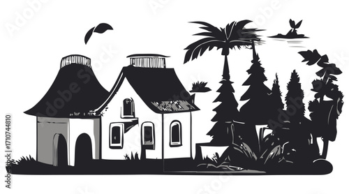 Illustration of a rural scene with houses, trees, and a bird in flight.