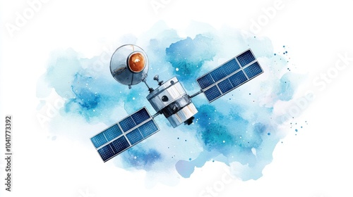 Illustration of a satellite in orbit with a colorful watercolor background.