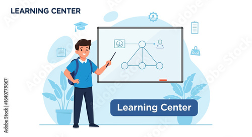 Illustration of a student presenting a network diagram in a learning center