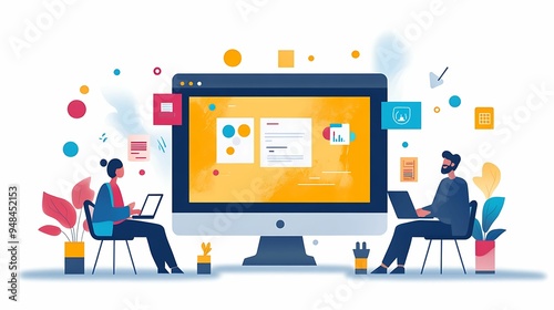 Illustration of a team collaborating in a digital workspace, with colorful elements representing online communication, file sharing, and teamwork.