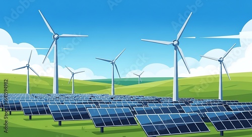 illustration of a wind farm and solar panels generating clean, renewable energy in a green field, a concept for a sustainable future.