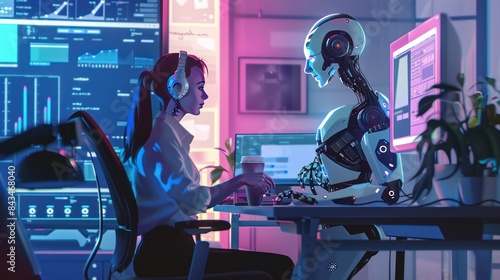 Illustration of a woman's head tie sideways modern cyborg robot artificial intelligence technology.