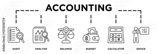 Illustration of accounting displaying its key steps: audit, analysis, balance, budget, calculation, advice icons and text