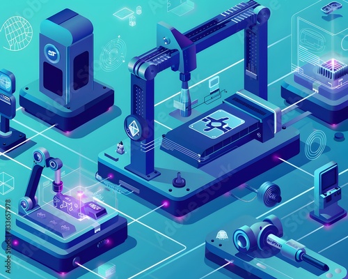 Illustration of Adoption of additive manufacturing (3D printing) and other advanced techniques to improve production processes. Ai Generate.
