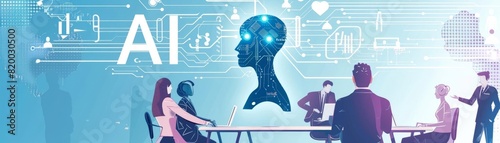 Illustration of business professionals in a brainstorming session with AI text overlaid on an electronic mainboard design