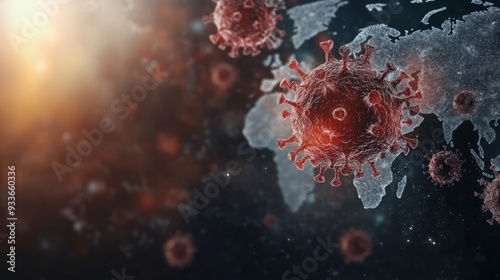 Illustration of COVID-19 virus particles on a global map, highlighting the impact of the pandemic across continents.