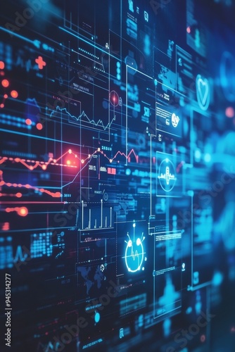 Illustration of economic policy affecting healthcare, represented by digital charts and healthcare icons