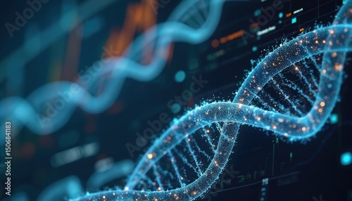 Illustration of genetic research with data and DNA visualization. Complex genetic sequencing data displayed on computer screen with visual DNA representation. Science, tech and medical innovation.