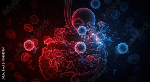 Illustration of Human Immune System with Virus Particles Engulfing Cells