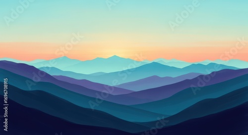 Illustration of layered mountain range silhouette at sunrise with gradient sky