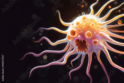 illustration of Microbe Sullivan, dark background with some golden-hued details.