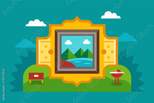 Illustration of ornate picture frame with landscape painting, displayed outdoors with blue sky, clouds, green grass, and a small table and drawer beside it.