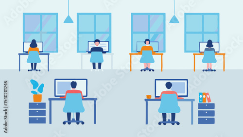 Illustration of people working at computers in an office environment with windows and desks, flat design