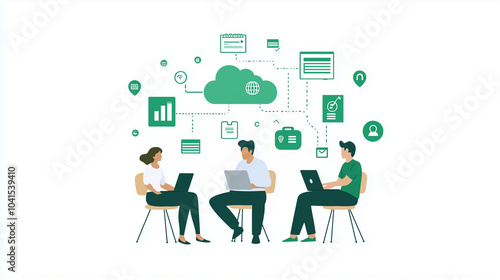 Illustration of professionals using cloud technology for seamless digital teamwork, remote collaboration, and efficient virtual communication in a business context.