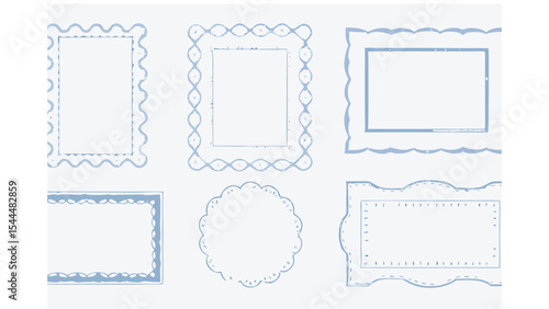 Illustration of six light blue frames with decorative borders in various shapes and sizes on white background