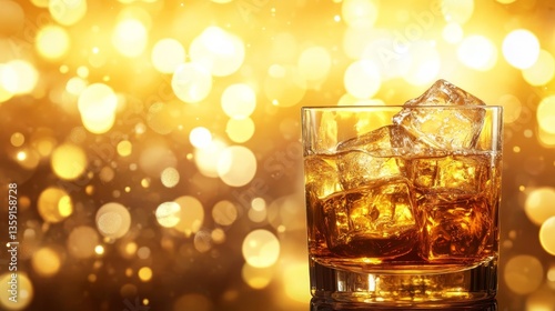 Illustration of sparkling whiskey on the rocks with a golden bokeh background for elegant aesthetic
