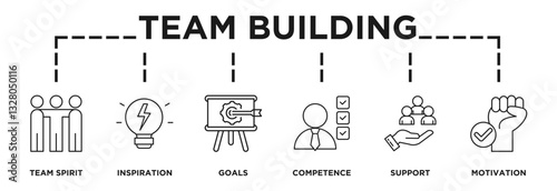 Illustration of team building displaying its key steps: team spirit, inspiration, goals, competence, support, motivation icons and text