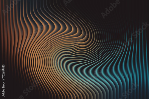 Illustration of twisting abstract lines with orange and teal gradient on dark background, futuristic design