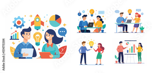 Illustration of two people sharing ideas. Teamwork and idea sharing concept. Flat style design