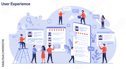 Illustration of User Experience Concept with People Interacting with Interface Elements.
