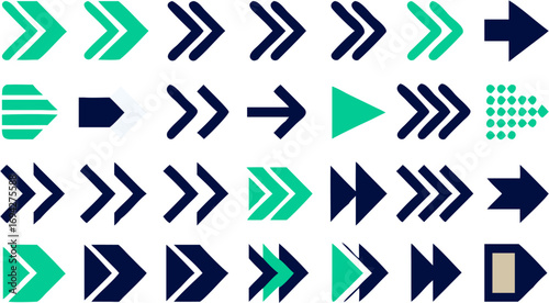 Illustration of various arrows pointing right in shades of green and blue on a white background artfully arranged