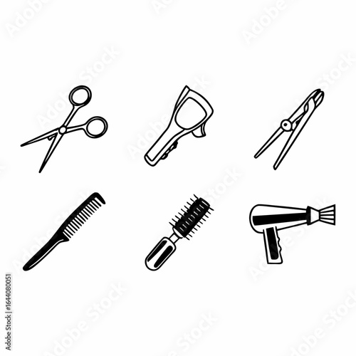 Illustration of various barber and salon tools including scissors, combs, brushes, and hair dryer isolated on white background