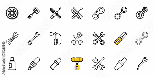 Illustration of various bicycle repair tools and components in a simple line drawing style format