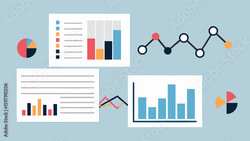 Illustration of various data charts including bar graphs line graphs and pie charts on a light blue backdrop