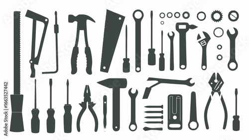 Illustration of various hand tools including hammers, screwdrivers, wrenches, pliers, and saws in silhouette