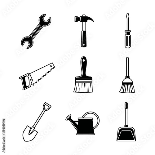 Illustration of various tools including a wrench, hammer, saw, shovel, and watering can design vector