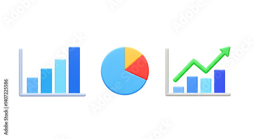 Illustration showing a bar graph a pie chart and a bar graph with an upward trending green arrow
