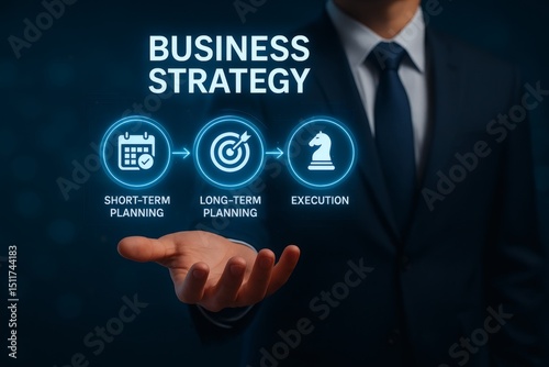 illustration showing a business professional holding a glowing planning diagram above hand, displaying icons for Short-Term Planning, Long-Term Planning, and Execution. Futuristic tech interface