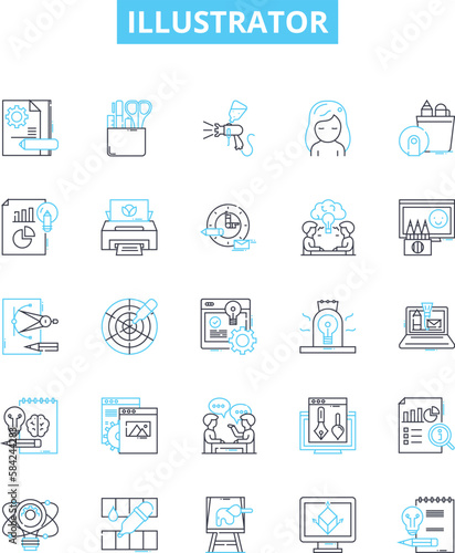 Illustrator vector line icons set. Illustrator, Vector, Design, Drawing, Create, Artwork, Pen illustration outline concept symbols and signs