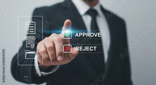 Image is a digital illustration featuring a business professional in a suit, with a focus on his hand interacting with a virtual interface. The background is blurred, emphasizing the subject's hand, w