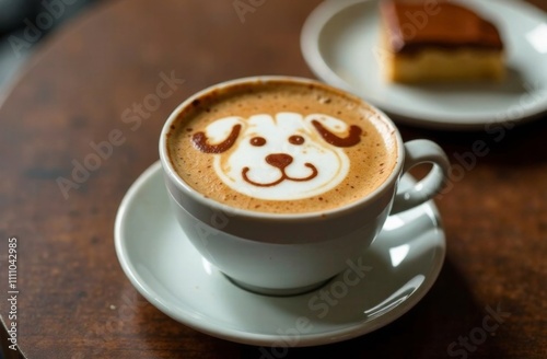 Image of a cute dog using cinnamon on cappuccino milk froth, latte. Dessert on a wooden table in a cafe