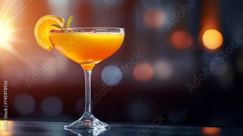 Image of a delicious cocktail presented on a sleek black tabletop, copy space for text