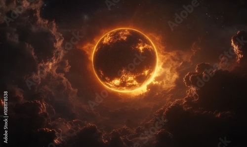 Image of a planet with a glowing atmosphere surrounded by clouds of gas and stars in a deep space setting