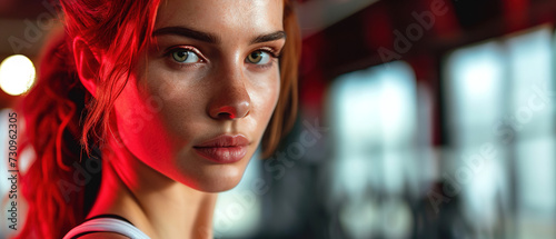image of a red haired woman in the gym, with empty copy space, sport advertising