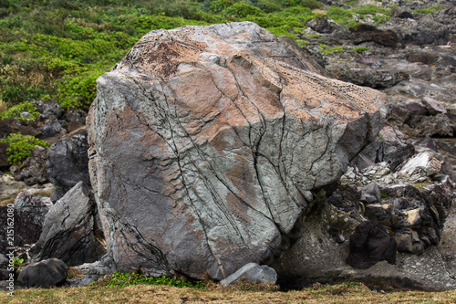 Image of a single large rock boulder, peach, salmon and gray/grey in color with multiple cracks in the side. Boulder is sitting on some brown grass, with green grass and small rocks in background.