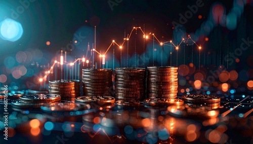 Image of a stock price line floating like a digital hologram with metal coins stacked underneath