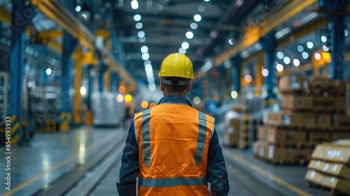 Image of a worker wearing protective gear and following safety procedures while working in a factory warehouse environment