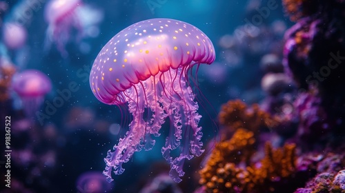 Image of an underwater scene with fairy jellyfish and coral reefs.