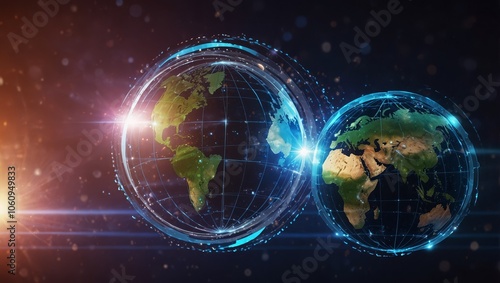 Image of circles with circles around globe and lens flares over abstract background. Digitally generated, hologram, illustration, globalization, telecommunication and technology concept