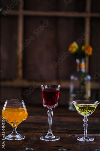 Image of colorfull coctails in the bar, mixology concept