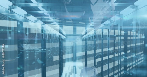 Image of data processing against light trails and mosaic squares against computer server room