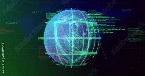 Image of data processing and padlock over globe and world map
